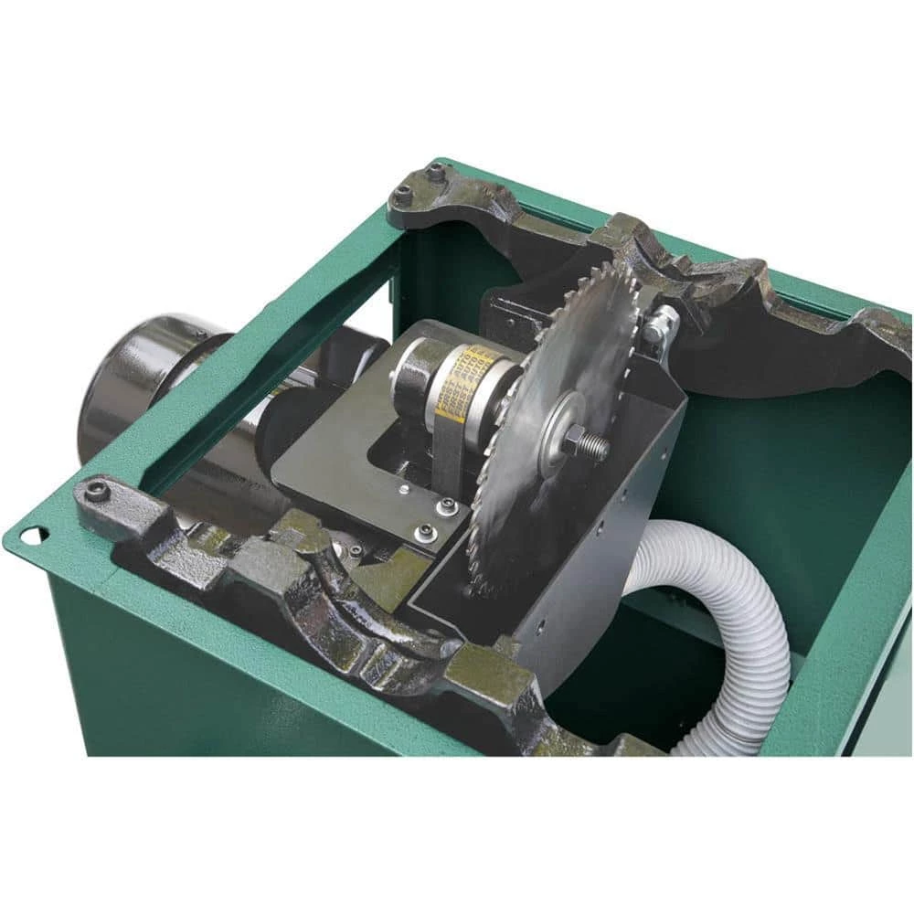 We took our G1023RL Table Saw with riving knife and made it even better by including a built-in router table that doubles as a table extension wing. The router table includes support legs and universal T-track router clamping system, and the Shop Fox Classic Fence included for the table saw doubles as a router table fence. You’ll find that using this system is actually much nicer and more convenient than using a typical router table or hand held router for those cuts where the fence is not required to be offset, especially if the table saw is set up with large outfeed tables. Another great advantage is being able to make laser straight dadoes without having to change table saw blades. CSA certified meeting CSA C22.2 #105-1953 and UL 987 standards. Features: Motor: 5 HP, 240-Volt, single-phase. Solid cast iron table is first heat treated to remove warpage, then milled perfectly flat and ground to a mirror like finish. Fully assembled table size: 48 in. W x 27 in. D. Table has T-slots so your miter gauge will not fall off the table when retracted. 5/8 in. Dia arbor is long enough to accept dado blades up 7/8 in. Extra large handwheels are the heaviest in the industry and really ease arbor movement.