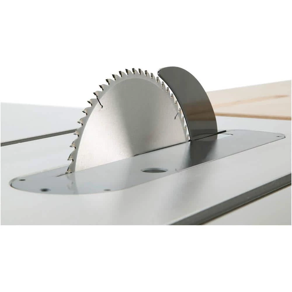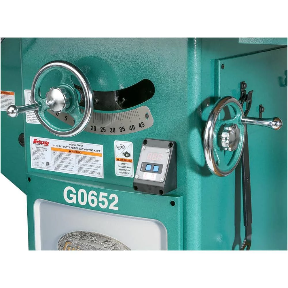 Cut panels and wide stock all day long with this 10 in. Heavy-Duty Cabinet Table Saw. A 52 in. rip capacity and extended side and rear tables will support a full sheet of plywood, making ripping and cross cutting operations safe and simple. A guard with splitter or interchangeable riving knife helps prevent binding and kickback, and a rail mounted magnetic switch with thermal overload protection provides additional safety features. Bevel cutting is also safe and precise with the left tilting blade and digital angle display. Includes a miter gauge and 10 in. blade. CSA certified meeting CSA C22.2 #71.2-08 and UL 987 standards.