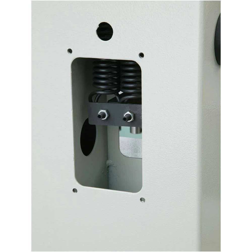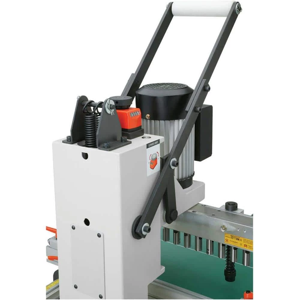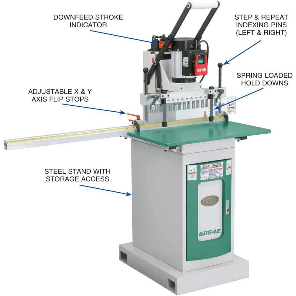 A 15-spindle boring head makes quick work of 32 mm cabinet construction. The hand lever activates the work holding clamps and lowers the boring head for easy and efficient drilling. Exact boring depth is also controlled by the down feed indicator. Bits are sold separately.