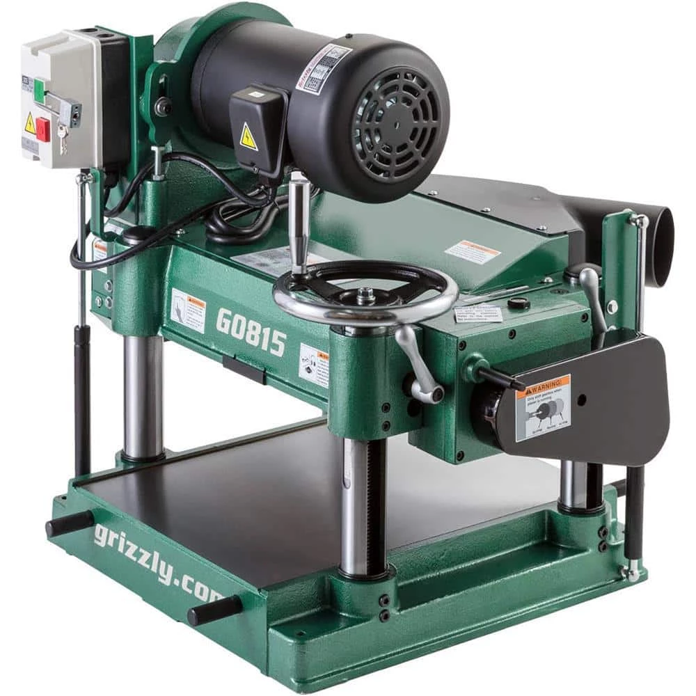 Exclusive from Grizzly is our G0815 15 in. Heavy-Duty Planer featuring a powerful 3 HP motor and 5000 RPM cutterhead speed. The headstock sits atop a 4-column support with easy handwheel height adjustment and column locks. The G0815 offers 2 feed-rate settings, letting you choose between 16 and 30 FPM to ensure the smooth finish you need on various wood types. This great 15 in. Heavy-Duty Planer can improve the functionality of your shop without sacrificing precious floor space, while still having the power you need to tackle large projects or do production work. 1 of the main advantages this planer provides that other heavy-duty models don’t is that the fixed table position makes it ideal for setting up with infeed/outfeed roller tables, which can add a big boost to production and overall convenience.