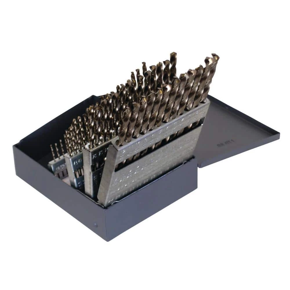 This #1 to #60 Cobalt Steel Drill Set is designed for tough and work hardened materials such as stainless, armor and INCONEL. The drills feature 135-degree split points to eliminate drill walking on work-pieces and precision Heavy-Duty construction with tight tolerances which make them ideal for extreme operating conditions. The cobalt steel material provides heat resistance in the drills for greater longevity while a straw finish adds lubricity. These drills offer superior rigidity for hand or machine drilling.