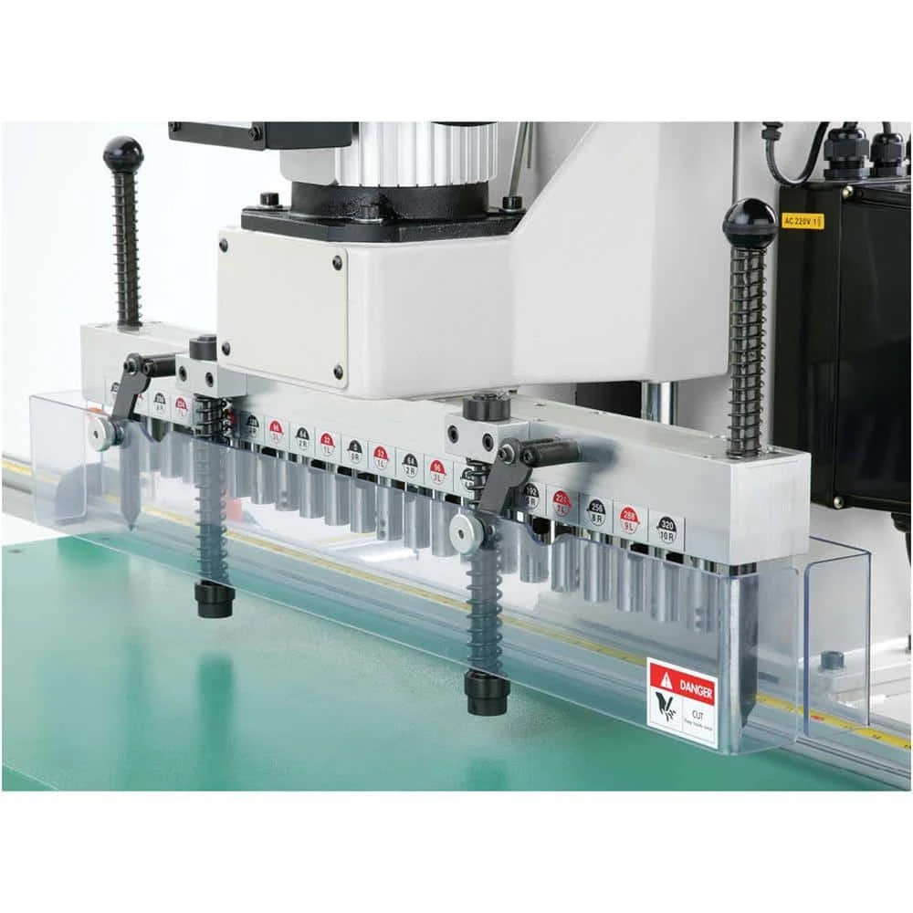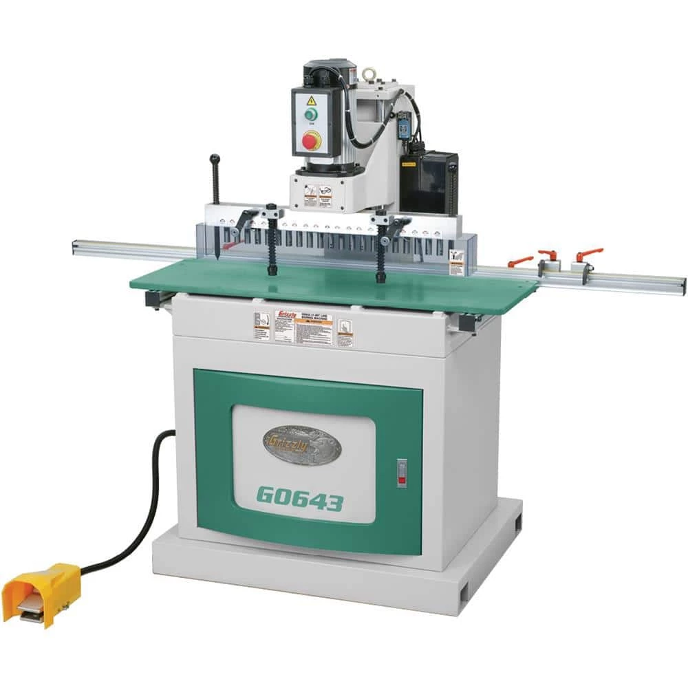 Speed up your 32 mm line boring operations with this 21-spindle, pneumatically-controlled Line Boring Machine. A single foot pedal controls the hold-down clamps and lowers the spindles for simultaneous boring. Right and left spring-loaded indexing pins also offset long stock for perfect step-and-repeat operations. Bits are sold separately.