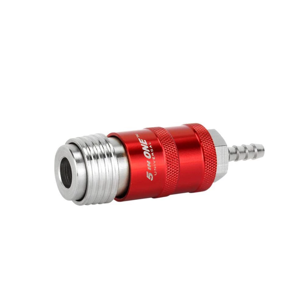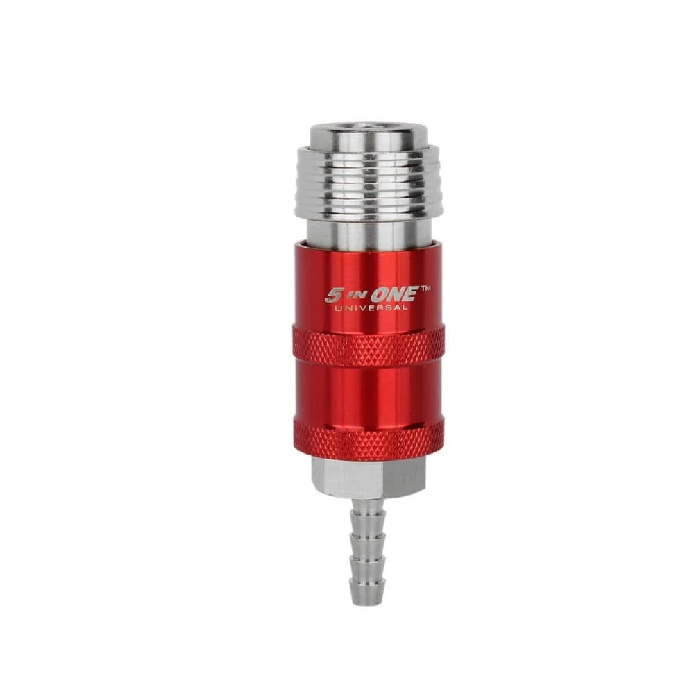 Milton’s 5-In-1 Universal Safety Exhaust couplers safely bleed excess air pressure and disengages fittings without dangerous blow-back from trapped pressure inside your air line or hose. This 1/4 in. ID industrial hose barb adapter can be used to safely disconnect from tools, replace a damaged hose fitting and provide a solid seal that won’t damage the tubing of your air tool hose. Instead, the air hose coupler remains connected to the plug while pressurized air is safely bled off. The universal design allows the air compressor fittings to be compatible with all major interchanges: Industrial (M-style), High flow (V-style), automotive (T-style), Aro (A-style) and Lincoln (L-Style). This sturdy barb coupler fitting is made of heavy-duty steel, making it the ideal air compressor accessory for any air hose or pneumatic tool that requires a long-lasting pneumatic coupler.
