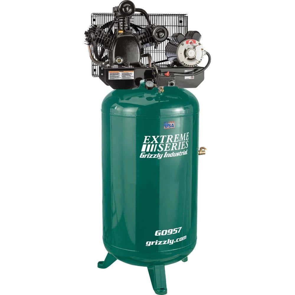 The Grizzly G0957 80 Gal. 5 HP Extreme Series Air Compressor is for commercial and industrial use and operates with a maximum pressure of 175 psi This compressor delivers 18. 5 CFM at 90 psi and 24 CFM at 40 PSI. Providing more complete motor overload protection than a magnetic starter that only senses current, the motor senses both temperature and current. The fan pulley and cooling fin design provide more efficient cooling to keep the unit from overheating. The 80 Gal. vertical air tank has been ASME certified to meet safety and quality standards. The one-stage cast-iron oil-lubricated pump operates at high pressure providing increased volume when you need it. Additional features include a tank pressure gauge, on/off switch, 1/2 in. NPT threaded fitting, easily accessible oil level sight glass, and oil drain with 4 in. extension. SPECIFICATIONS:Motor: 5 HP, 230V, single-phase, 22. 5AAirflow capacity: 18. 5 CFM at 90 psi and 24 CFM at 40 PSIMaximum air pressure: 175 PSIOverall size: 26 in. W x 32 in. D x 68 in. HApproximate shipping weight: 400 lbs.