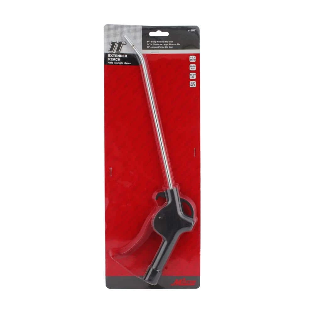 Take on those challenging narrow, tight spaces with Milton’s S-167 10 in. Extended Reach Safety Tip Blow Gun. The 10 in. narrow, bent nozzle not only fits into tight spaces, it also comes with a side vent, making this product OSHA compliant. This pistol grip type body offers a molded comfort grip along with both an integrated hook as well as a hang hook for storage. 1/4 in. NPT brass air inlet offers a secure fit onto hoses. This blow gun offers a pressure range of 30 lbs. to 90 lbs./sq. in. and 16.5 SCFM. APPLICATIONS: Home garage, Pro auto shop, Industrial, Heavy-duty, Farming/Agricultural use and more. Long-reach, contoured grip, 10 in. extended angled safety nozzle OSHA-Compliant 1/4 in. national pipe thread brass air inlet 16.5 standard cubic feet per minute (SCFM)- 90 maximum psi Product dimensions: 15.5 in. x 3.88 in. x 0.88 in., Packaged dimensions: 16.5 in. x 6 in. x 0.88 in.